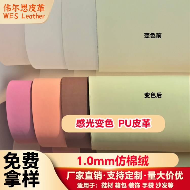 感光变色仿棉绒pu皮革面料 1.0厚鞋革箱包手袋 厂家定制人造革皮料