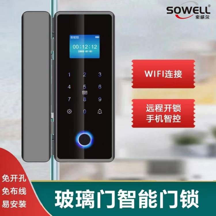 索威尔玻璃门锁指纹锁大屏免开孔遥控手机解锁智能锁办公室密码锁