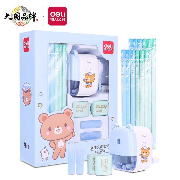 DELI 68896 萌咿系大礼包 铅笔 卷笔刀 橡皮 握笔器 学习文具17件套 蓝色