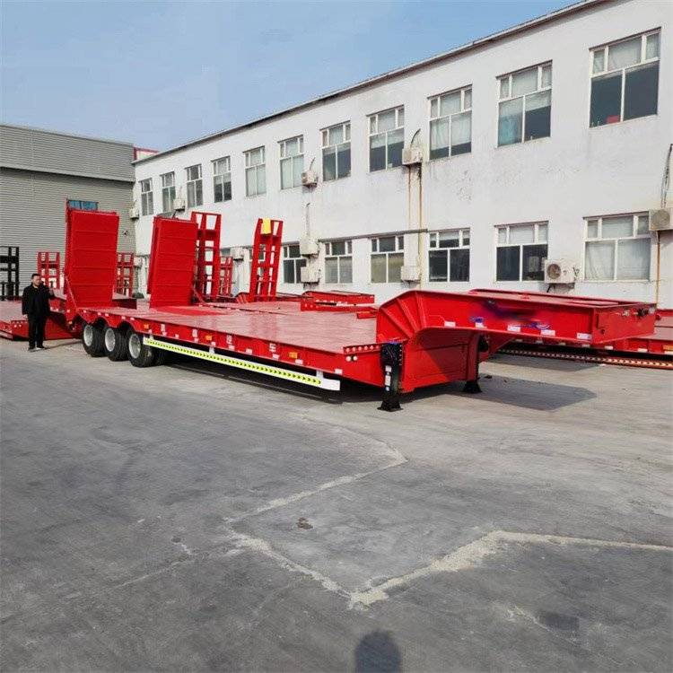 低平板运输半挂车 11米钩机板运输车 液压爬梯挂车