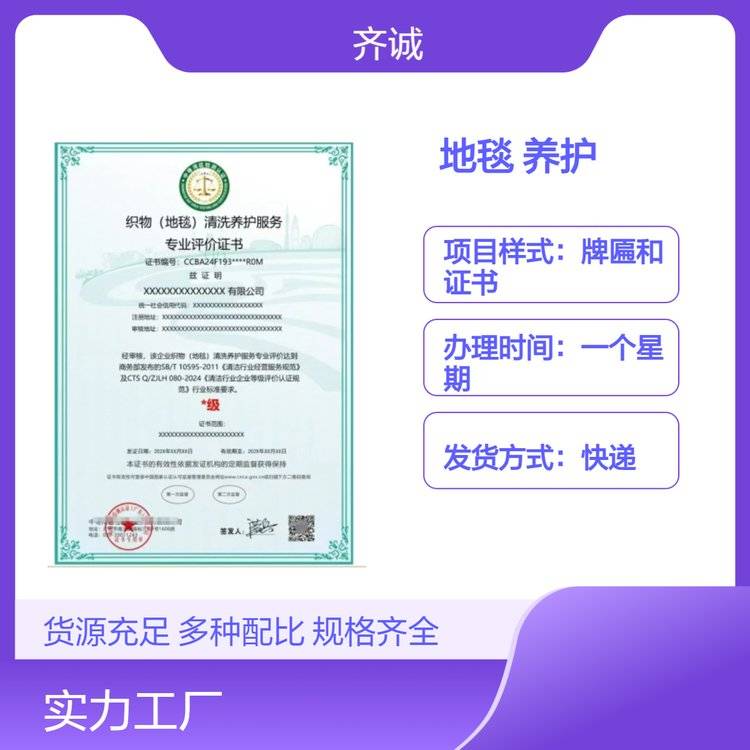 全国织物(地毯)清洗养护服务专业评价证书 一对一专业办理 牌匾证书