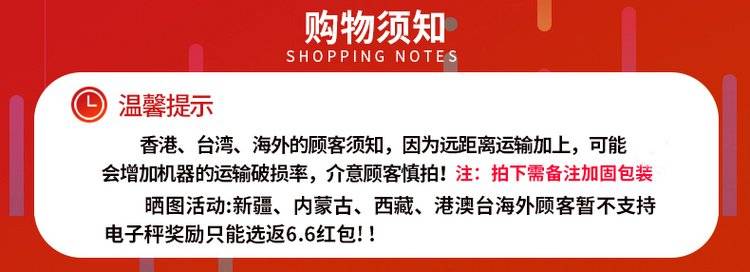 香港、台湾、海外的顾客须知,远距离运输可能会增加机器的运输破损率,介意顾客慎拍