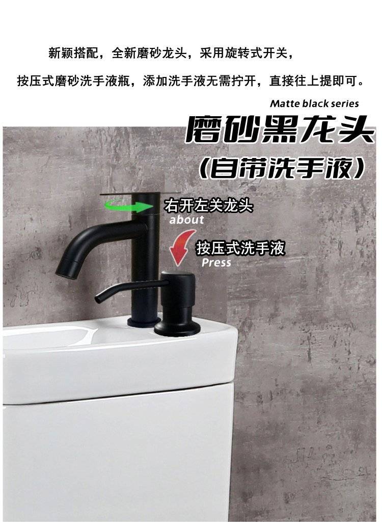 新颖搭配,全新磨砂龙头,采用旋转式开关,按压式磨砂洗手液瓶