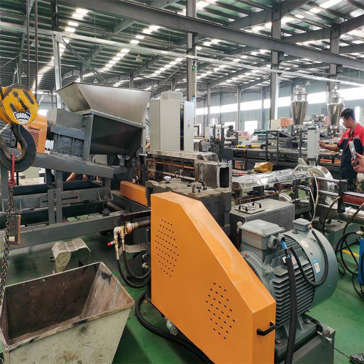 低烟无卤电缆料造粒机:配置包括密炼机、提升机、锥双喂料机、双螺杆造粒机、单螺杆造粒机、对吹式风冷模面热切机头、三级旋风分离器、风冷振动筛、成品料仓。密炼机先将原材料充分混合塑化,提升机将团状料输送到锥双喂料机,再依次经过双螺杆和单螺杆挤出机,最后通过切粒、冷却、筛分等工序得到成品。