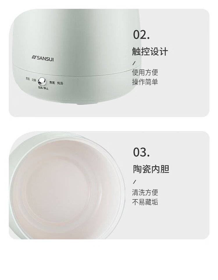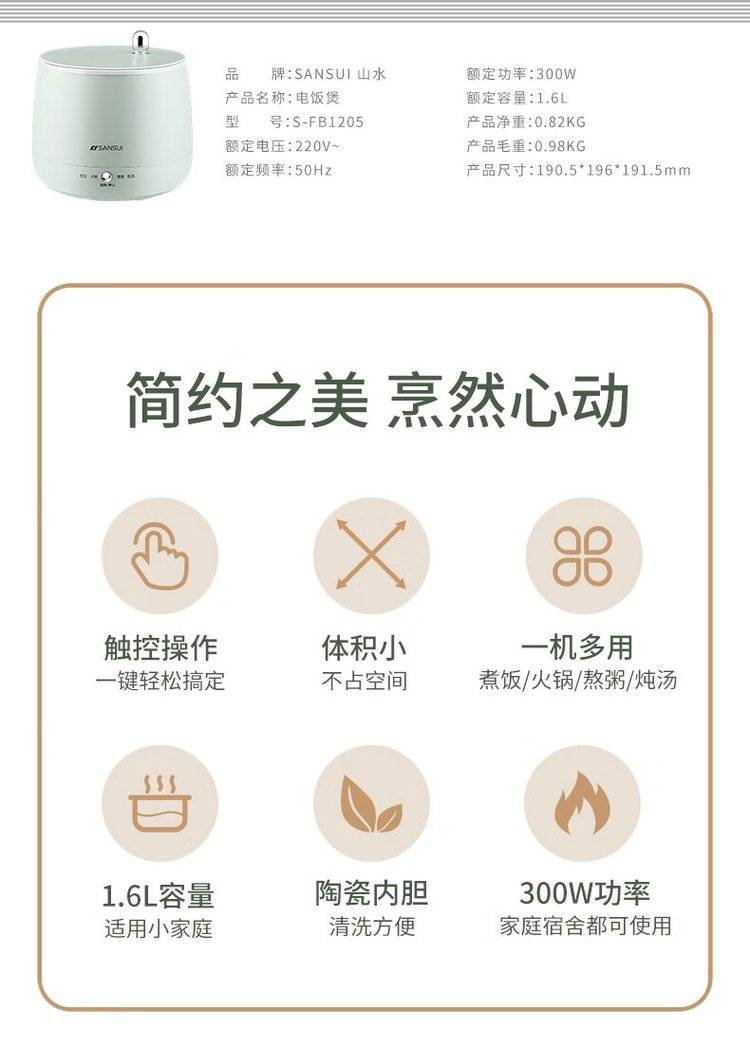 山水 电饭煲S-FB1205煮饭火锅熬粥炖汤 家用宿舍迷你电饭锅不粘1.6L