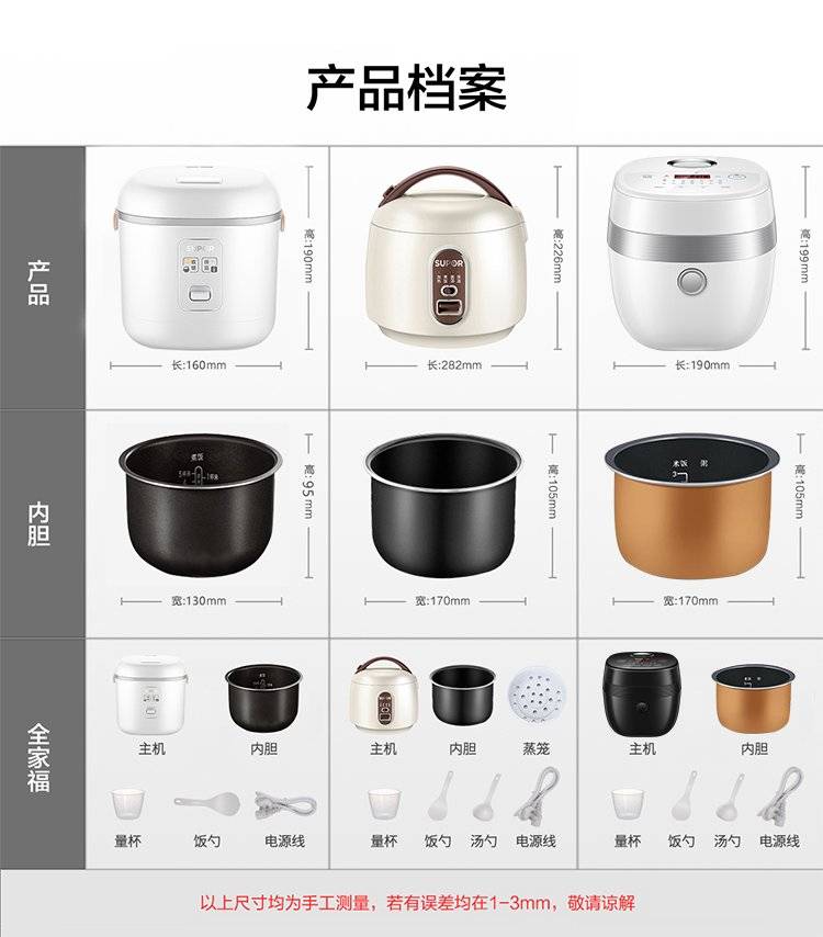 主机, 蒸笼, 内胆, 电源线, 量杯, 饭勺, 汤勺