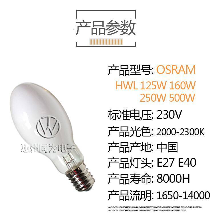 欧司朗品牌HWL250W高压汞灯 220V 5600流明显色指数60