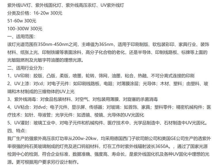 紫外线高压汞灯 UV光固机灯管 固化灯 365nm 资质齐全