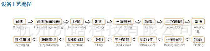 r面块预压擀薄延展---自动灌浆机机注油酥---自动包酥--继续预压擀薄延展---折叠(可选折叠次数,取决于要求成品的层次度)--再次预压擀薄延展--分切成品---和成型机对接
