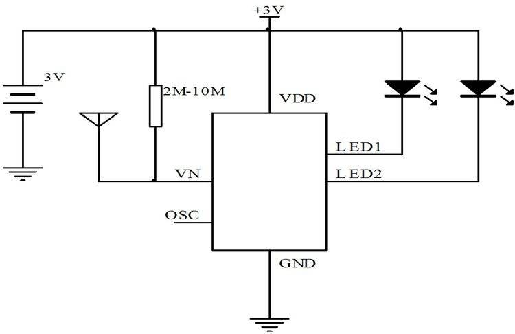 一、功能及应用 EGSM1来电闪IC芯片 手机来电闪IC芯片专用于手机来电显示,采用COMS工艺,当手机(800MHz、900MHz、1800MHz)来电或手机天线有信号发送时,IC输出控制信号使2LED顺闪。当电路第一次上电时LED先顺闪后进入待机状态,当来电或打电话时LED会闪烁直到无信号时停,LED闪烁频率为4Hz 接收灵敏度由天线决定 二、电气性能(VDD=3.0V,GND=0,Ta=25℃) CharacteristiesSymMinTypMaxUnitRemarks工作电压Vdd2.035V 静态电流Isb 5μANo load驱动电流Iol 14mAVdd=3V(红色LED)储存温度Tstg -40 125 ℃±15%工作温度Temp02560℃ 三、来电闪IC脚位邦定图: