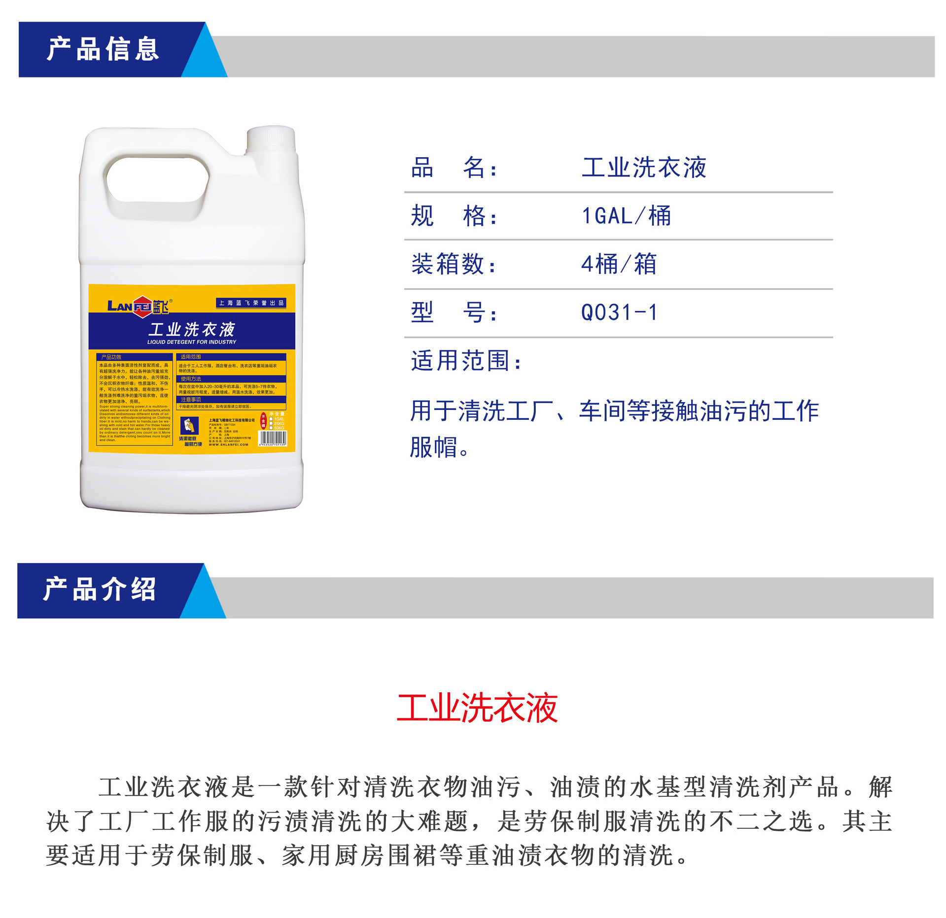 蓝飞工业洗衣液由多种表面活性剂复配而成,能让工业油污充分溶解于水中,轻松除去,去污强劲,不会沉积衣物纤维;性质温和,可以冷水洗涤,能洗净一般洗涤剂难以洗净的重污垢衣物,且使衣物更加洁净、亮丽。