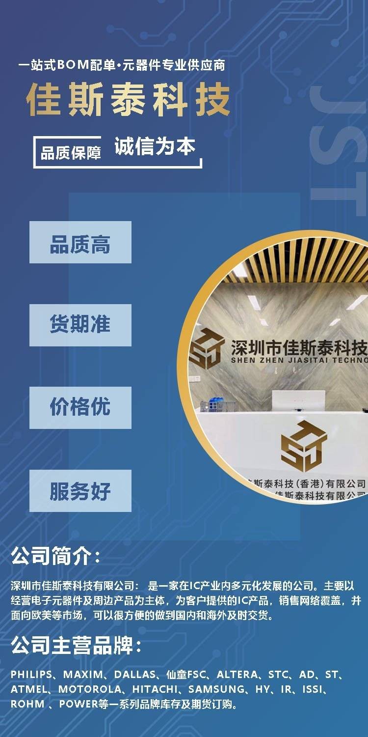 公司简介:深圳市佳斯泰科技有限公司: 是一家在IC产业内多元化发展的公司。主要以经营电子元器件及周边产品为主体,依托与北美、欧洲、港澳台、东南亚等地区完善的销售网络,代理、分销国内外品牌电子元器件及提供优质的配套服务,包括**级,工业级,偏冷门及一系列民用IC,模块,二三极管,LED. 随着电子产品的飞速发展以及日趋激烈的市场竟争,我司为了保持与世界电子行业的变化及发展,全面采用计算机网络管理,与世界各大公司电子元器件数据库相连, 密切沟通,采用计算机网络管理, 并与国内外的一些主要代理商及库存经销商建立起密切合作关系,为公司长期货源的持续及产品的更新提供了有力的保证!我们秉承以诚为本,质量和服务至上的原则,保证产品质量,出货及时快速,为客户提供的IC产品。销售网络覆盖,并面向欧美等市场,可以很方便的做到国内和海外及时交货。