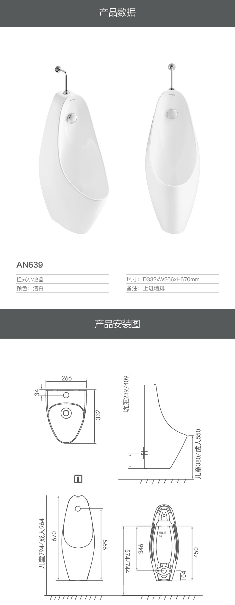 卫生间 挂墙式男士小便池家用陶瓷落地小便斗 自动感应小便器 AN639