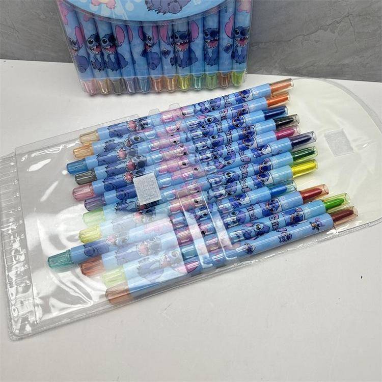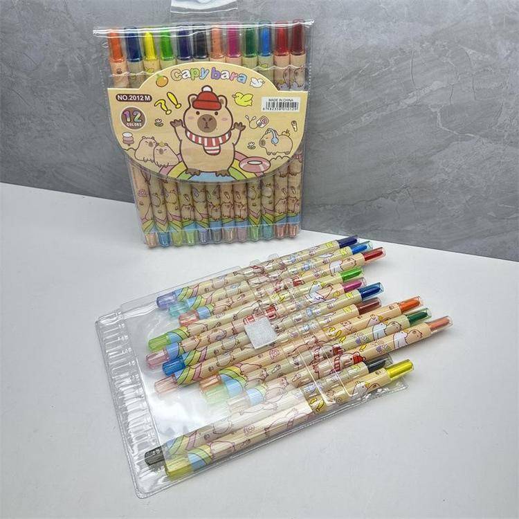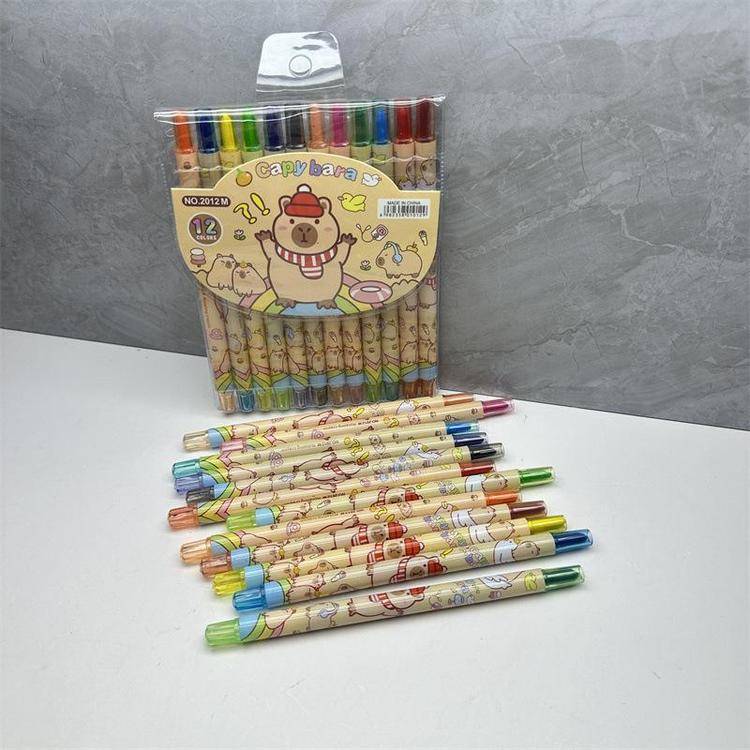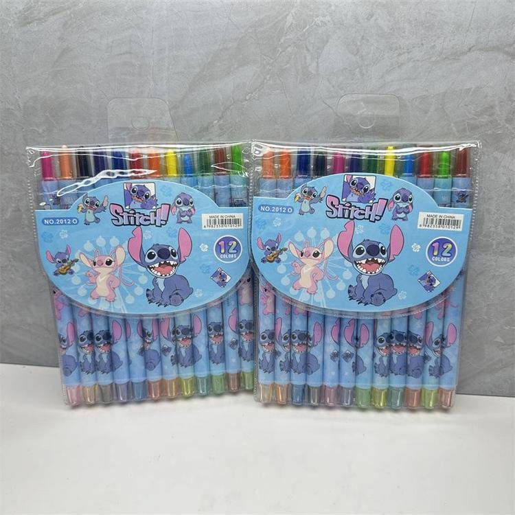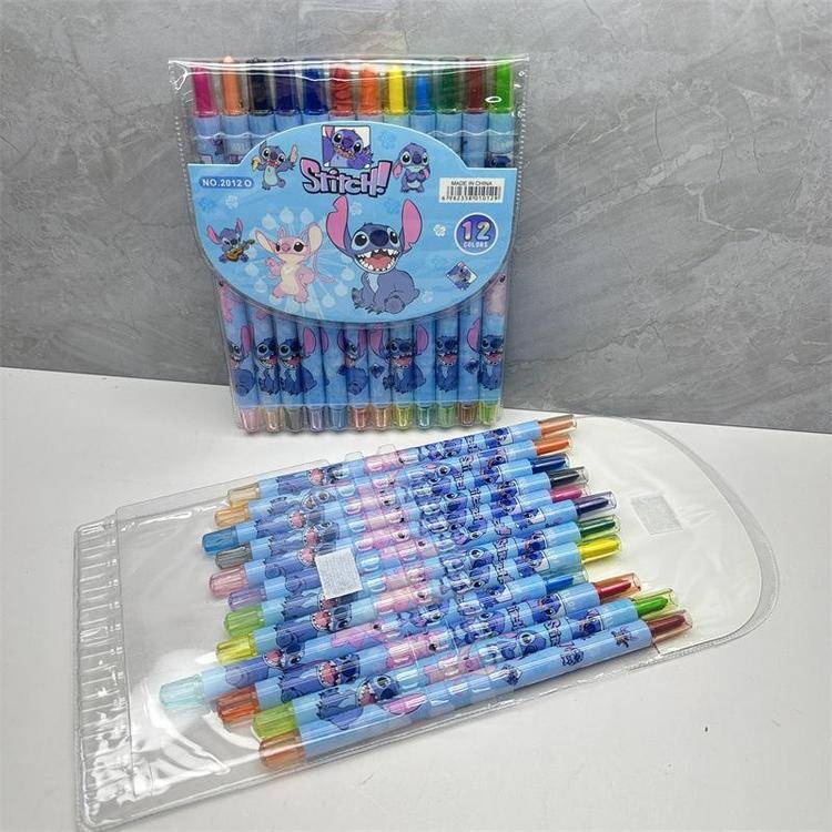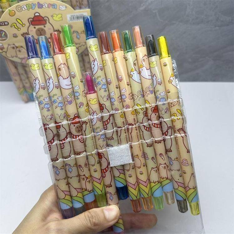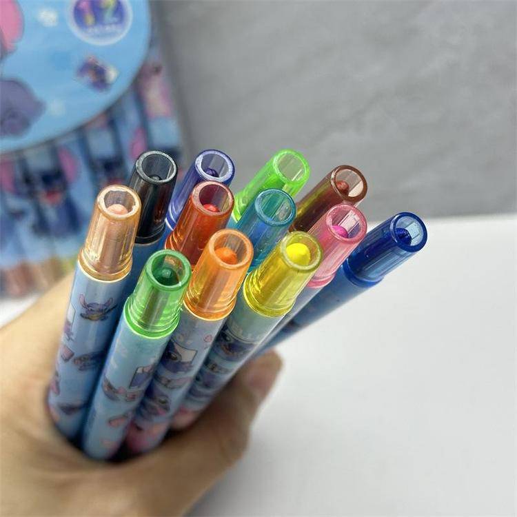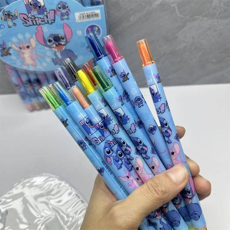 外贸史迪仔旋转油画棒史迪奇12色蜡笔卡皮巴拉水豚长款涂色绘画笔