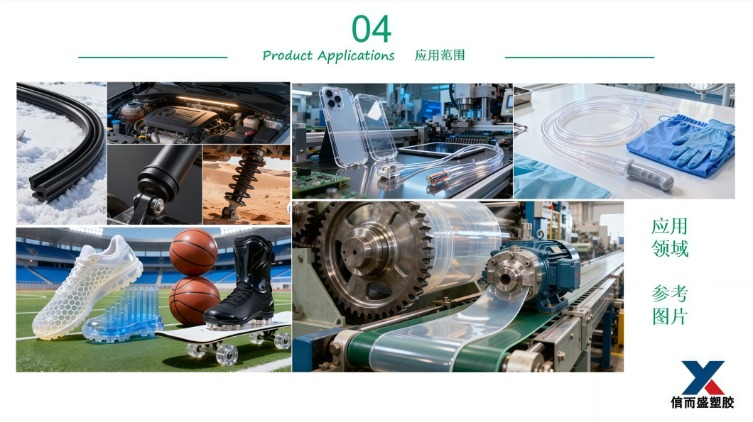 鞋材制鞋(鞋底、鞋革、鞋扣)、体育器材(护具、运动配件)、工业机械(密封件、防滑垫、软管)、消费电子(防护套、柔性夹具)、日常耐用件(表带、缓冲配件)