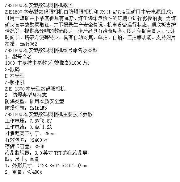 ZHS1800本安型数码照相机 自动对焦 使用方便简单