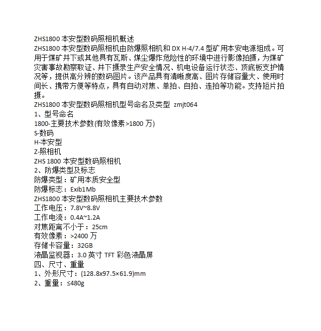ZHS1800本安型数码照相机 使用时间长 携带方便