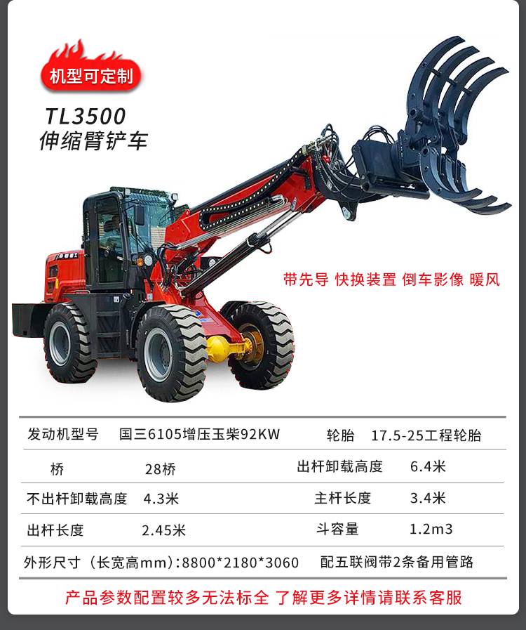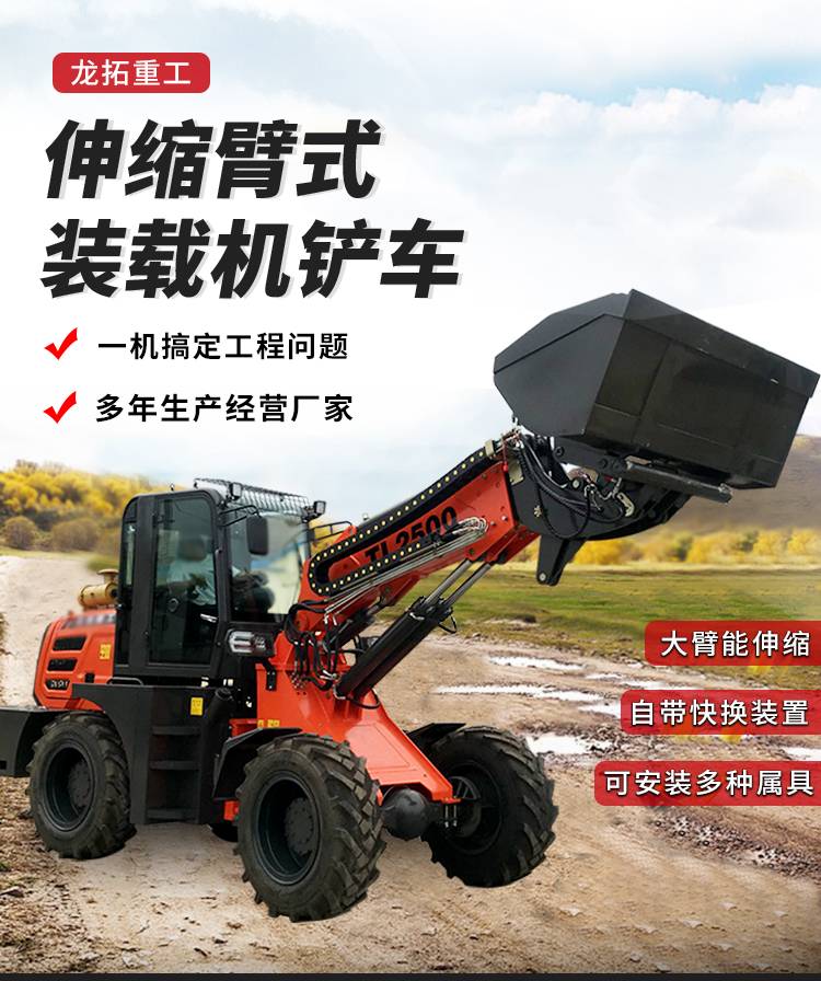 大臂能伸缩加长臂叉装车多功能伸缩臂装载机安装多种属具龙拓
