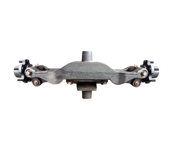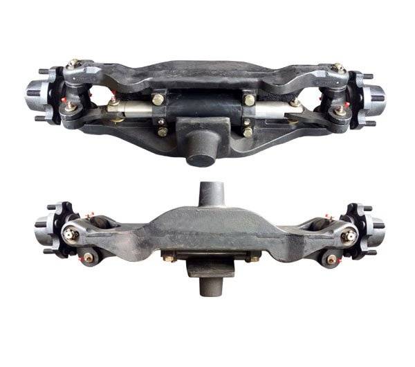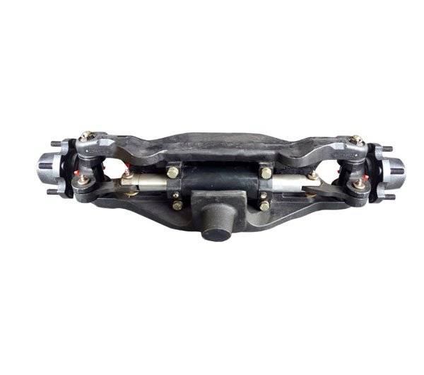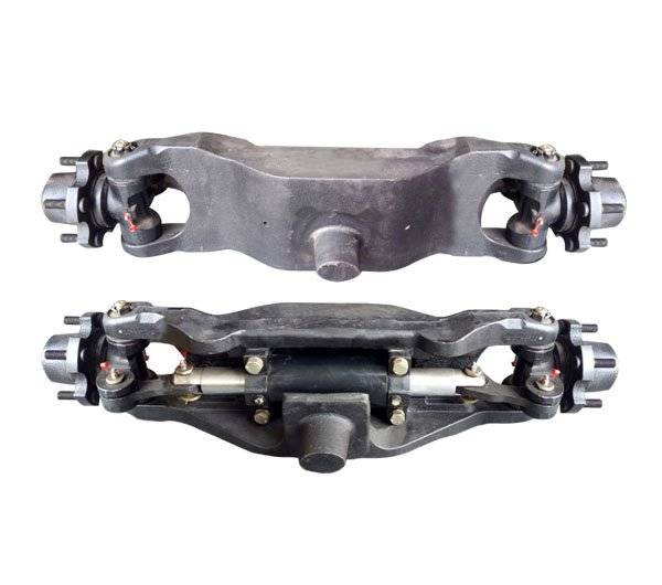 叉车转向桥通过壳体的两端安装轴固定于叉车底盘车架上,静载和空车行驶的时候,转向桥负荷主要来源于叉车配重couter weight和 整车自重Net weight,鉴于转向桥的设计安装位置,存在由于叉车工况繁重和超载超负荷长时间连续使用,地面不平坦工况,频繁转向,以及日常后桥润滑保养不到位导致的故障问题。较为常见的故障则是转向桥主销轴承座和主销摩擦磨损产生的主销轴承座孔磨损成不规则的椭圆或异形状态,从叉车使用状态表现得故障现象是前进行驶中跑偏,后轮摆动晃动严重,转向不灵活和方向盘打到底无法实现既定转向角度等问题,除了壳体两端主销轴承座以外,安装轴偶尔也会出现与壳体腹板筋板焊接位置开裂,安装轴断裂等故障,故障原因基本上是安装轴硬度材质不合格,承载变形,与壳体焊接工艺存在缺陷,焊接完成后未作探伤检测,堆焊气孔和满焊工艺质量控制标准须要改善,叉车高速行驶中遇到路面沟坎剧烈颠簸产生强烈冲击,车身自重和冲击力作用于安装轴后超出设计性能材质和工艺标准,出现安装轴的开裂。另外的可能原因还包括后桥减震橡胶块的脱落,磨损,开裂后,安装轴与车架底盘缺乏减震块有效吸收冲击力,导致安装轴断裂,整个后桥总成脱离车架的严重安全事故。