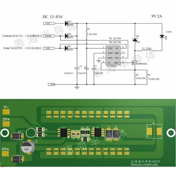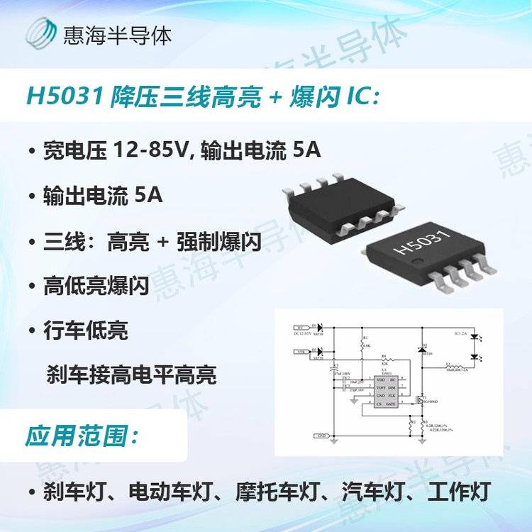 【惠海半导体3.1-100V输入LED车灯方案,平均电流,高亮、低亮,远近光、爆闪应用解决方案,智能过温保护,短路保护,一致性高】