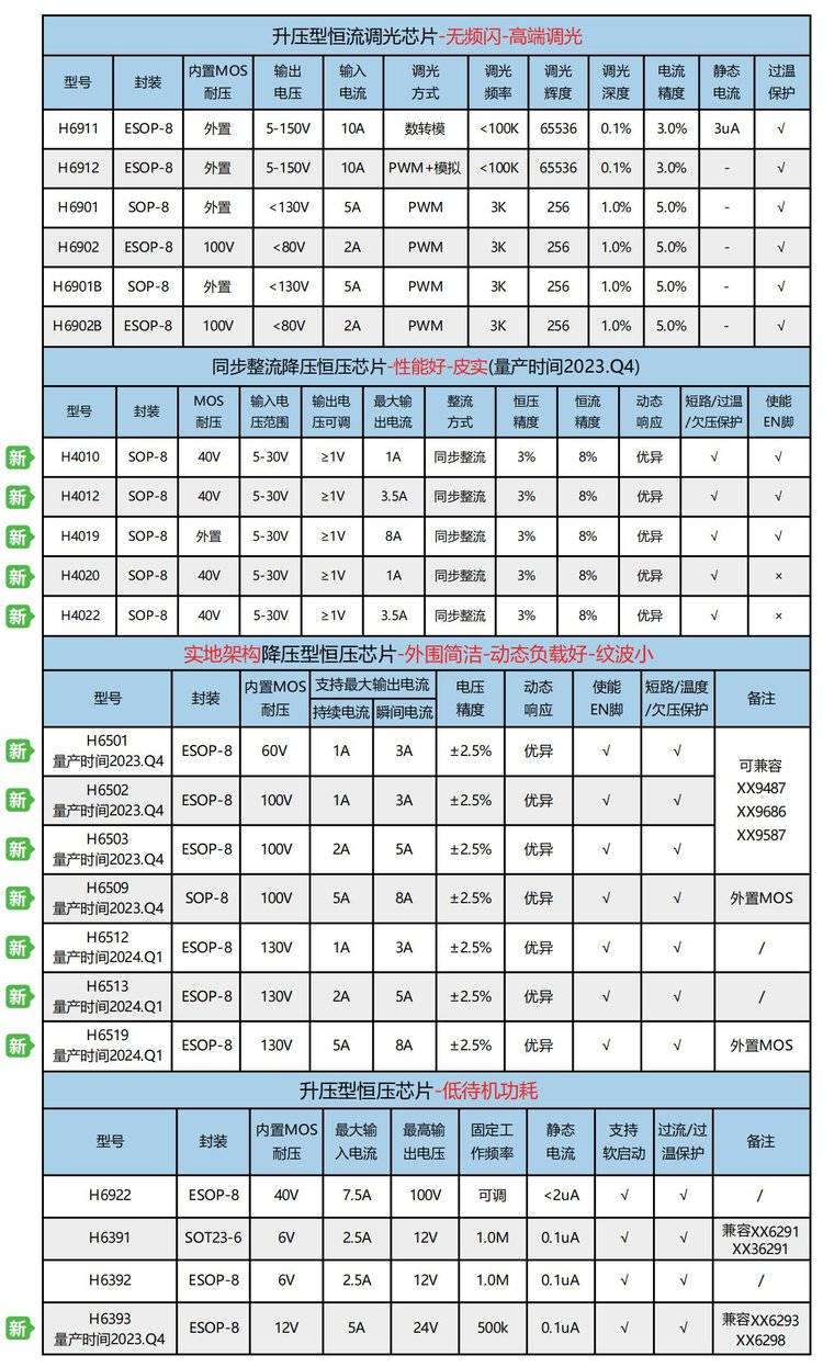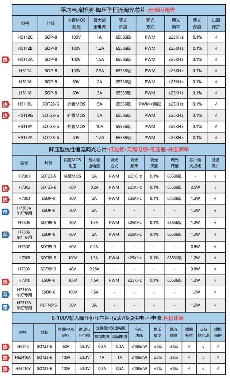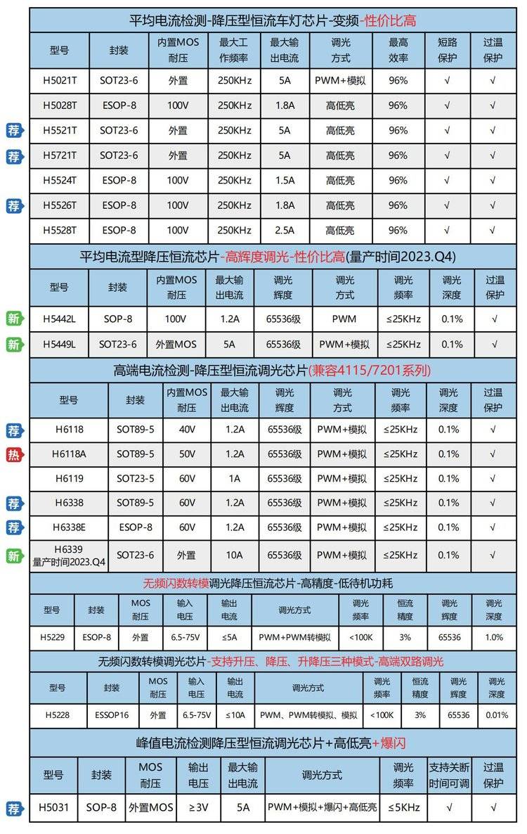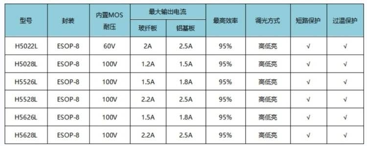 惠海H5526L/H5626L,H5528L/H5628L,H5022L/H5028L高品质,皮实耐抗,耐压最高100V,无论是前装的12V还是后装的12-80V,我们的车灯芯片都能完美适配。