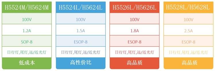 H5524M/H5624M和H5524L/H5624L,为低成本,高性价比之选,可优先适配小功率的日行灯和尾灯,对于参数不大的远/近主灯也可适用。
