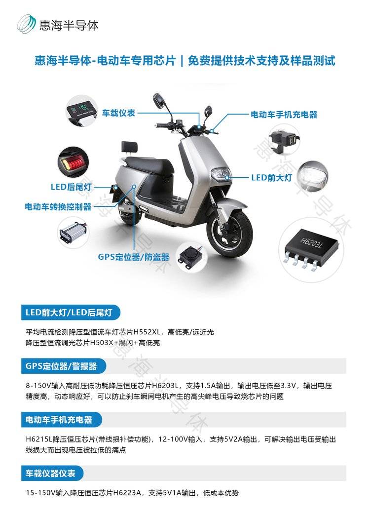 电动车/摩托车灯一般包括:远光灯,近光灯,日行灯,转向灯,尾灯,氛围灯等。为了确保电动车灯的正常工作,需要选择适合的恒流芯片来控制电流输出。接下来惠海半导体带您一起来了解一下,每种车灯的特点和适配的恒流芯片。