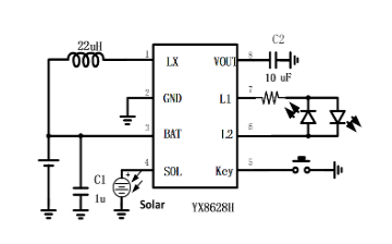 裕芯YX8628H输出电压3.3V内置按键闪灯模式选择 太阳能灯串芯片IC