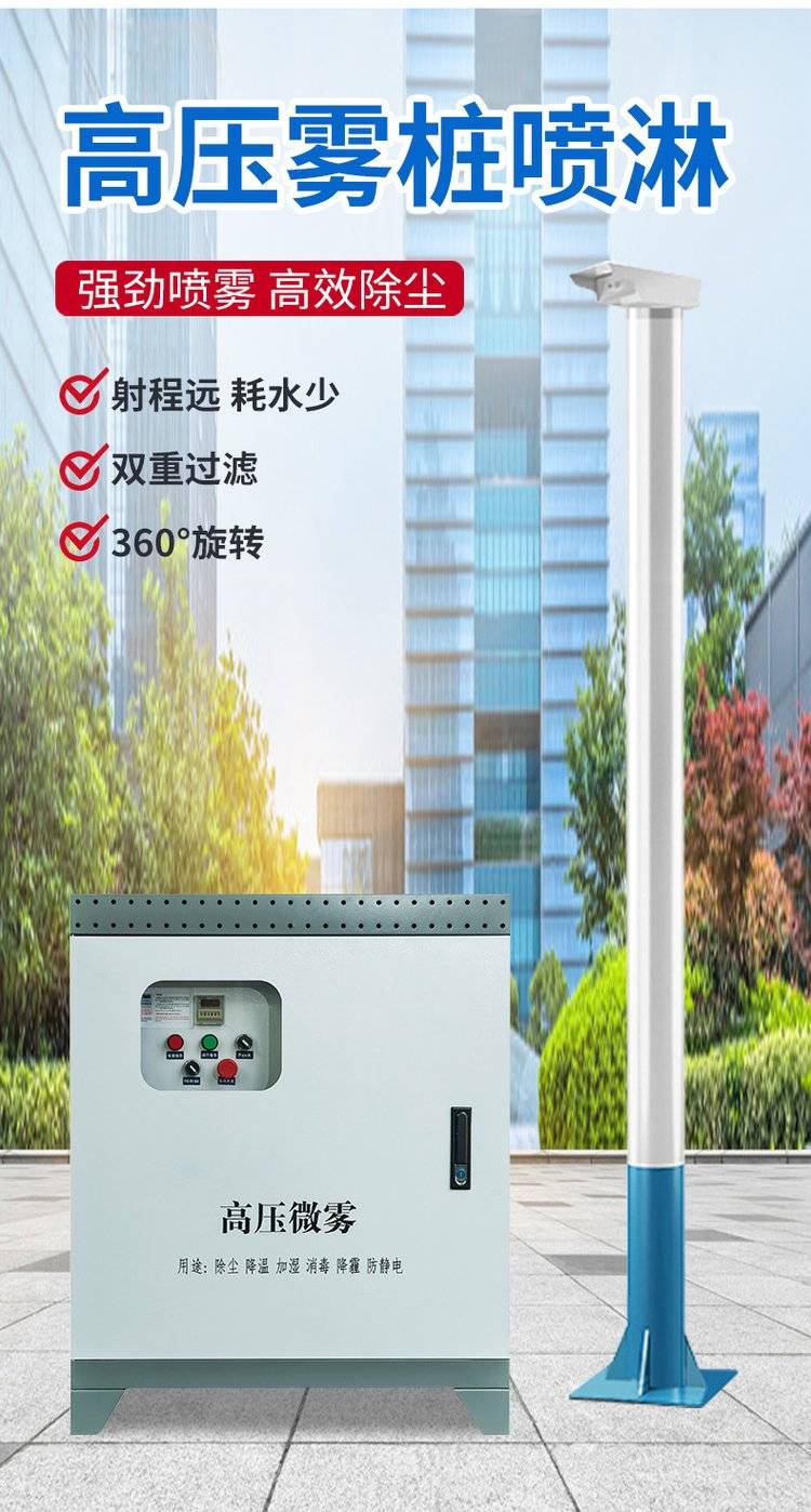 新型智能喷雾桩针对室外扬尘具有的开放特性而研发,是由高压供水主机、喷塑防锈立杆、智能旋转机头(喷头可360°旋转),PLC人机交互系统等组成。