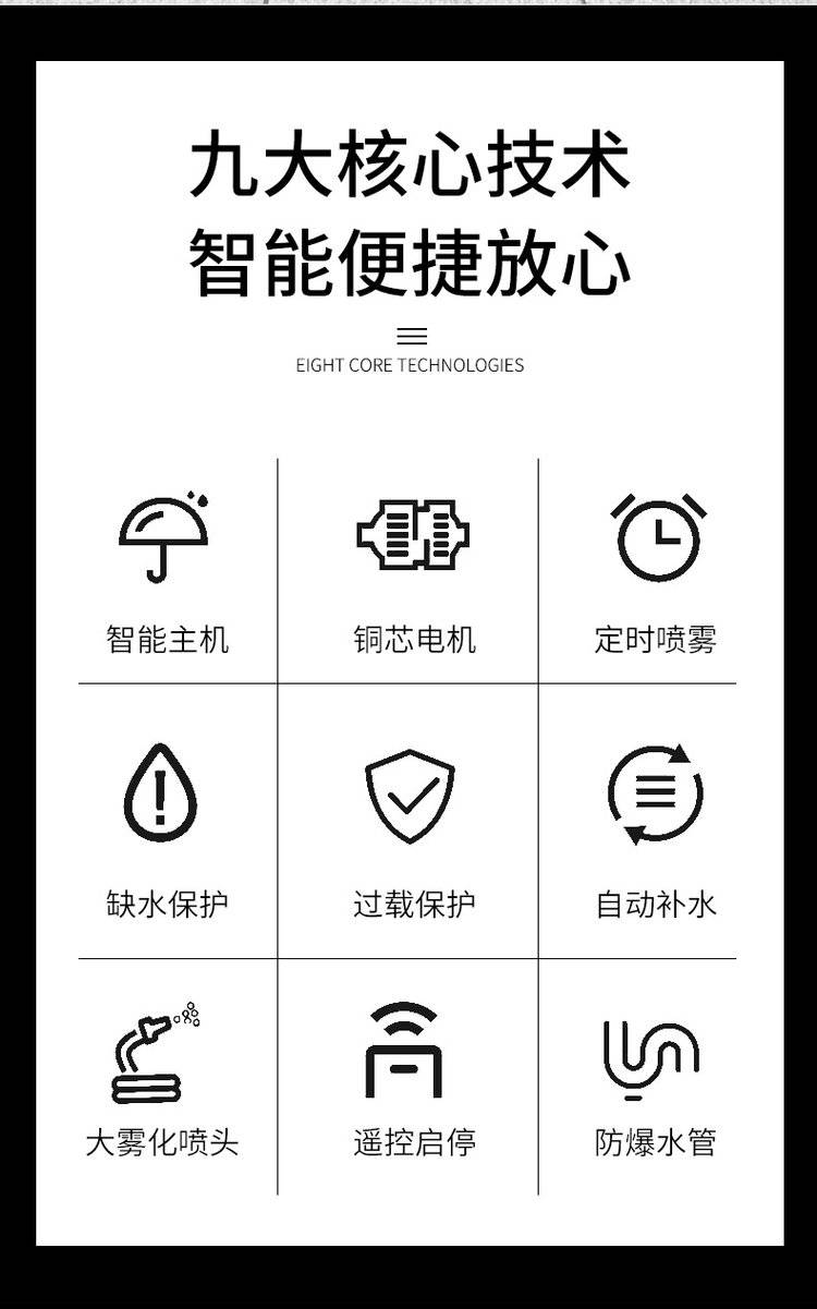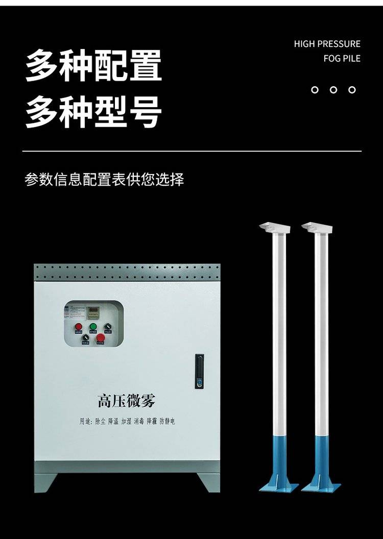 由电磁阀开闭供水,可实现任意单桩运行和多桩组合运行,每台机头配备独立电子脉冲式旋转云台,可通过PLC人机交互系统对旋转云台的旋转速度以及旋转角度进行任意值设定,PLC人机交互屏幕可实时监控设备运行状态,机头的实时运行角度,运行速度,电磁阀的开闭状态等,具有雾化效果好、耗水量低、安装布置灵活等特点,可多台并网安装,也可单立安装。