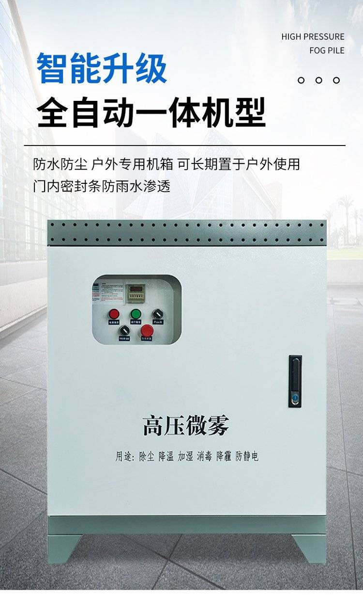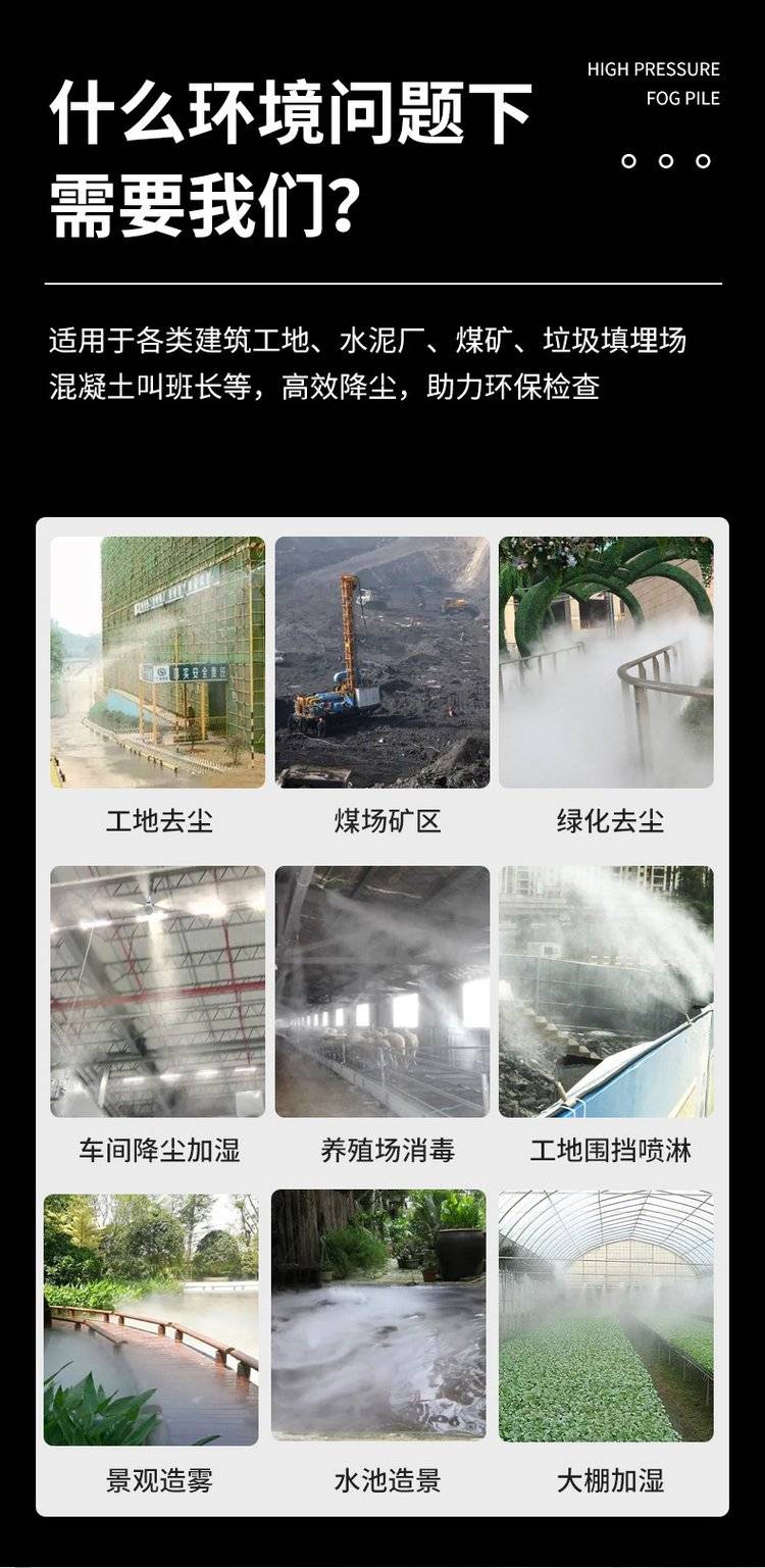 它是一款主要正对于室外扬尘较大的场合进行快速有效的抑尘产品。该装置在水泵动力源驱动下将水加压至80-100公斤高压,通过以水造物的原理,将雾喷射半径达到20米左右,覆盖面积500-1000方米。