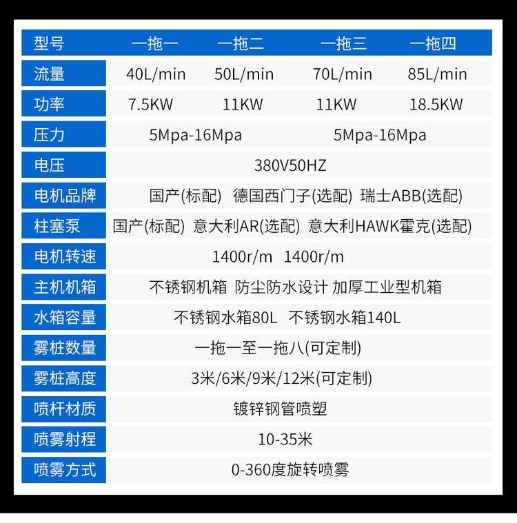 雾桩按照喷嘴的流量就可以选择主机泵的大小,从一拖一,到一拖十六都可以。(注意:一拖多的情况下需要计算上压力和流量的损失,是距离远的情况下)。