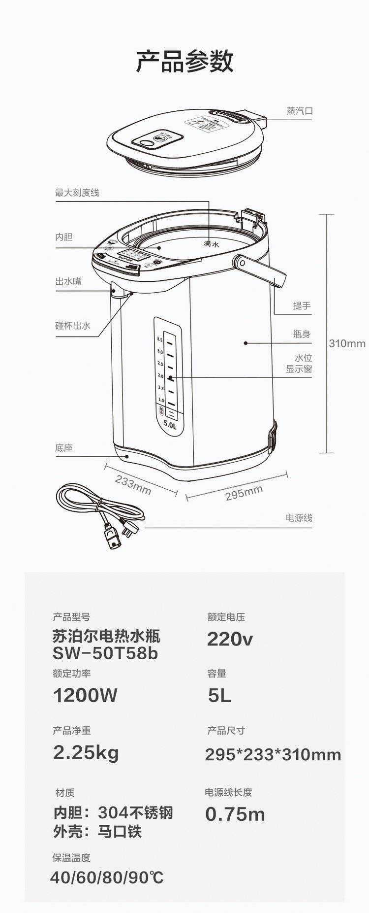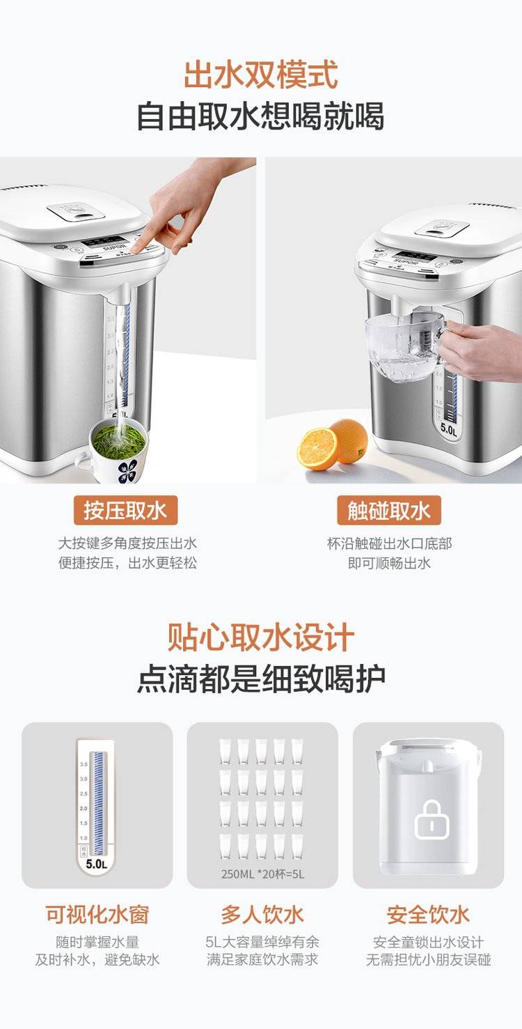 苏泊尔电热水瓶家用烧水保温智能恒温5L电水壶304不锈钢烧水壶
