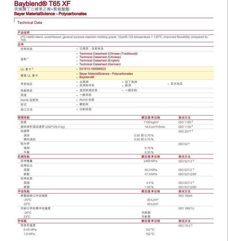 高溶脂PC/ABS T65 XF 科思创 合金材料 注射成型t65 Xf 聚碳酸酯+ABS