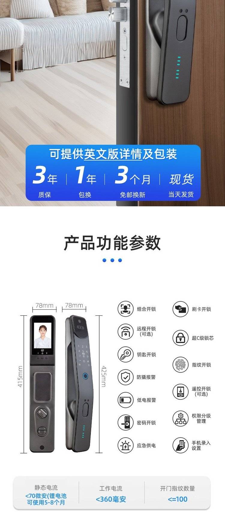 3D人脸、指纹、密码、刷卡、APP、机械钥匙,微信临时密码开锁