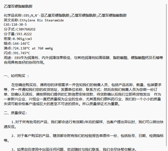 乙撑双硬脂酸酰胺 CAS:110-30-5 EBS作为润滑剂