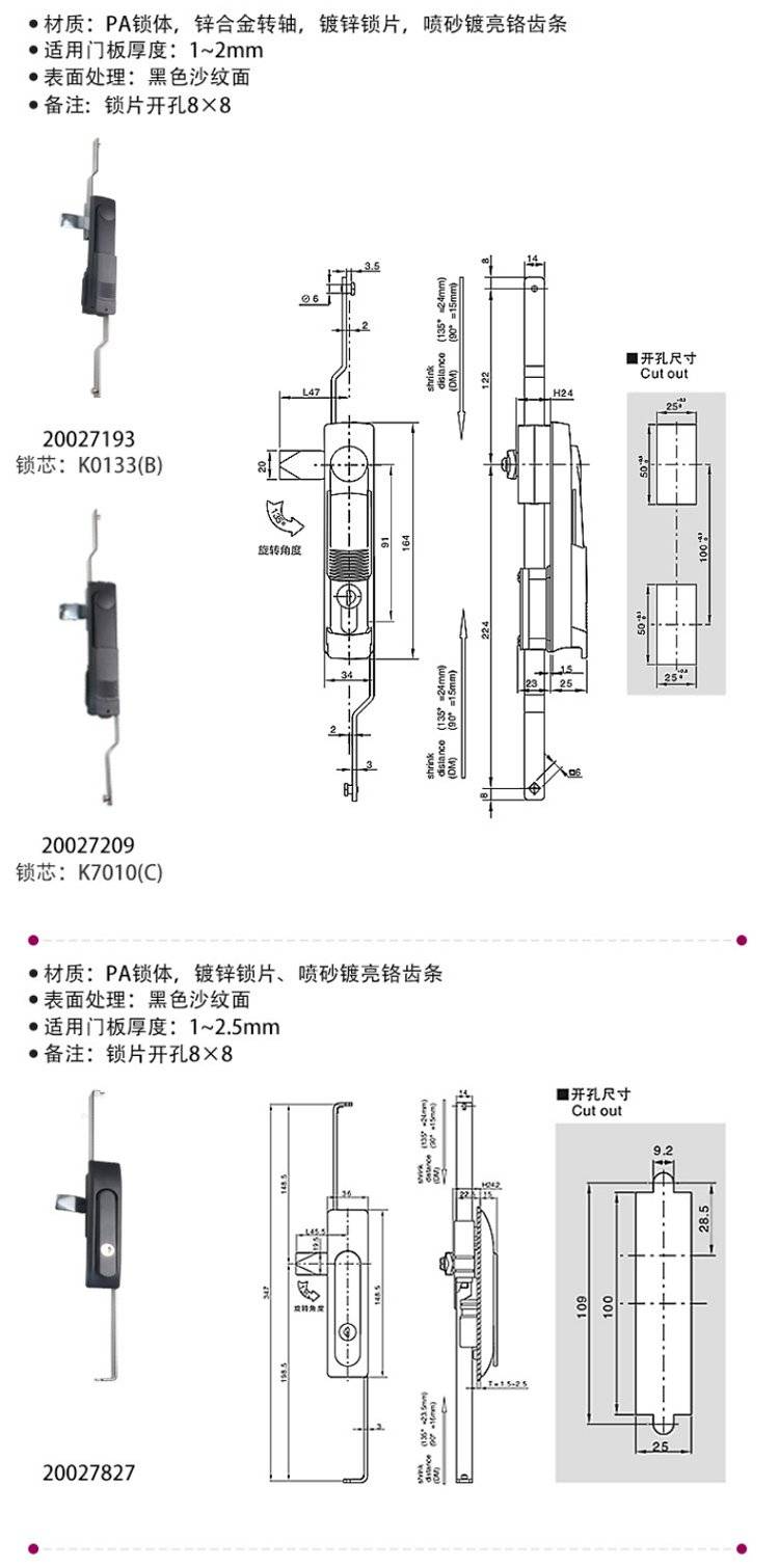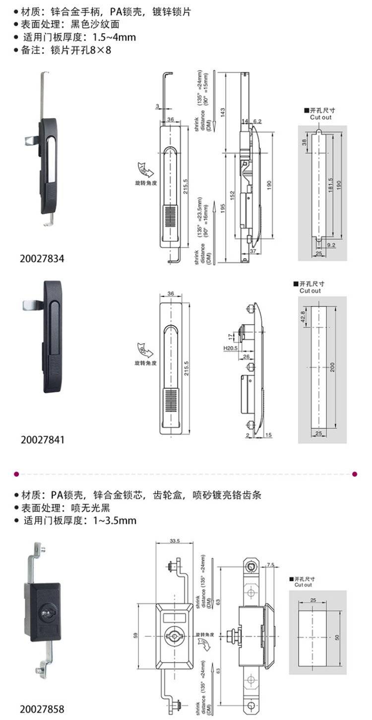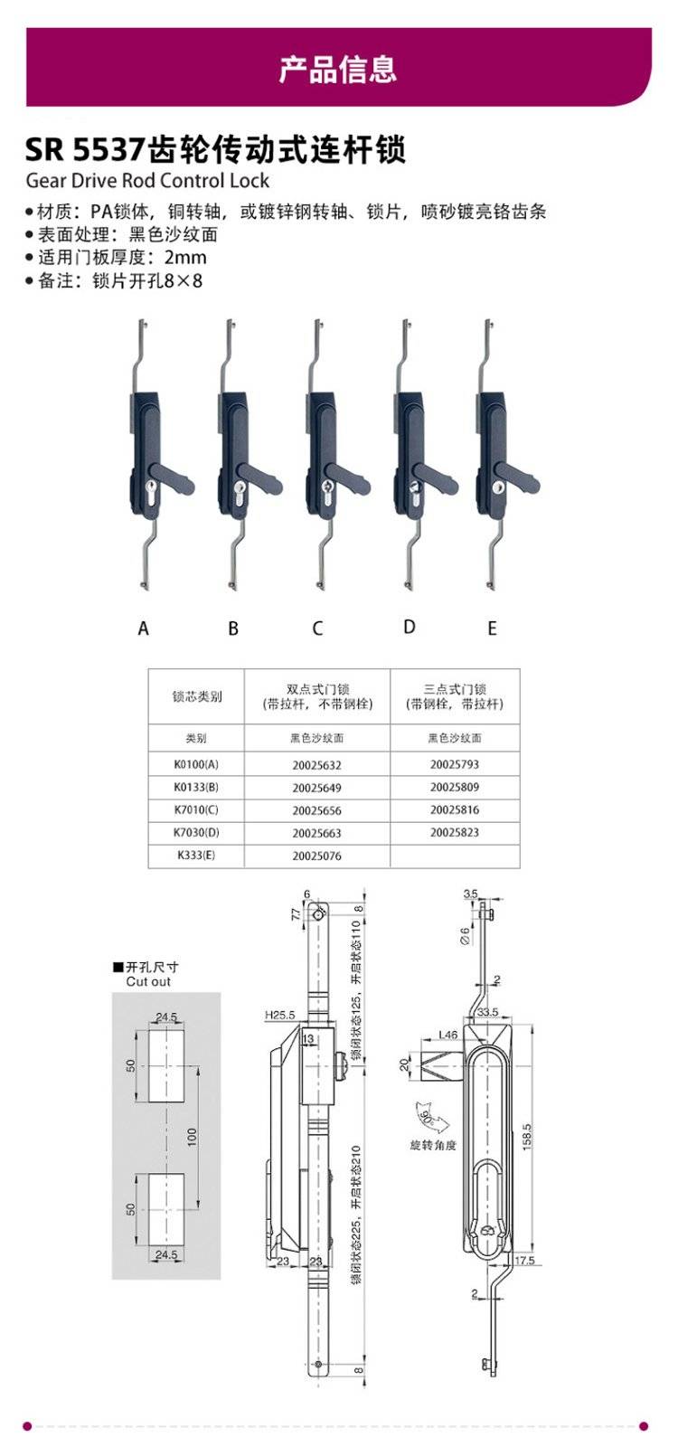 ESSENTRA益升华 三点式锌合金配电箱柜门锁 SR 5537齿轮传动式连杆锁