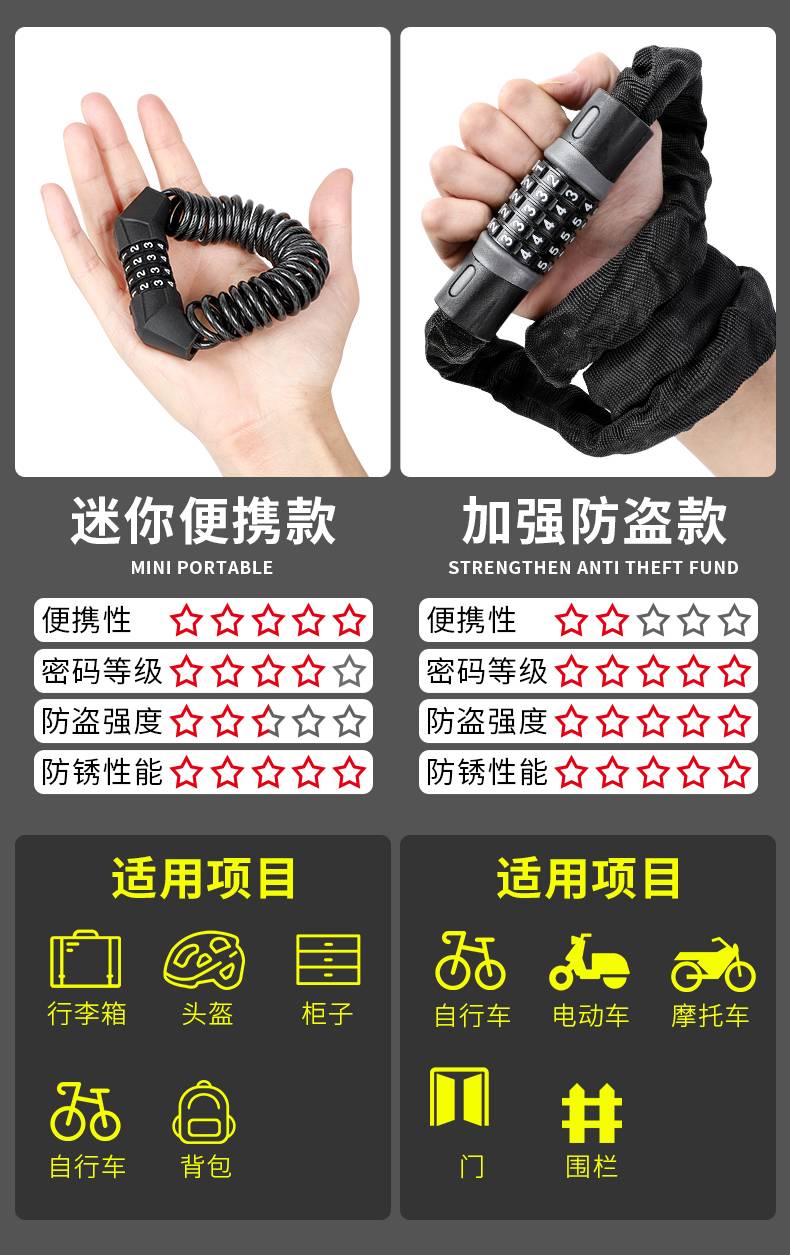西骑者山地自行车锁头盔锁摩托车防盗便携锁电动车密码迷你链条锁