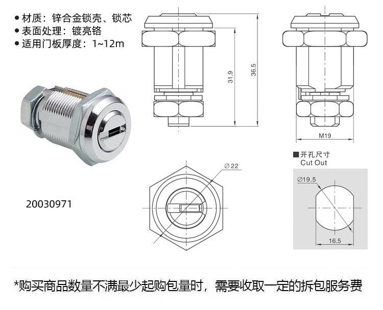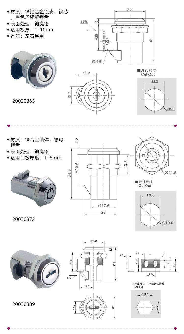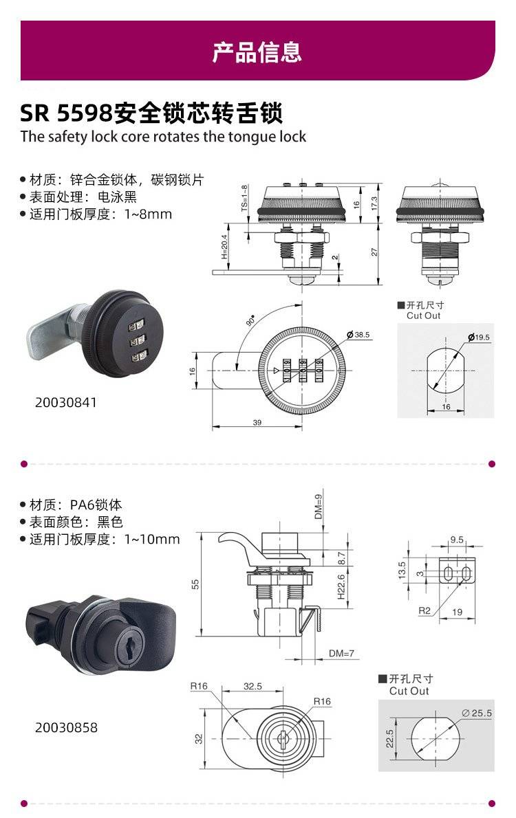 益升华 锌合金柜锁具 机箱机柜锁抽屉锁 SR 5598安全锁芯转舌锁
