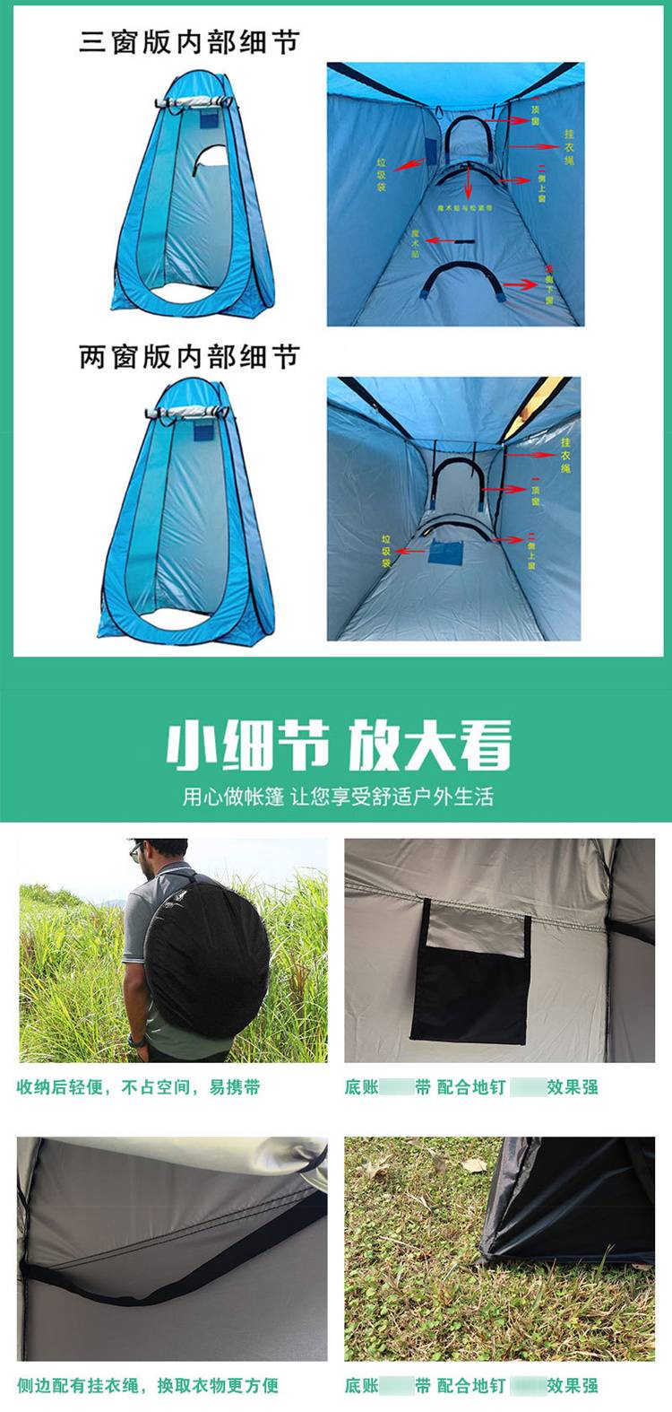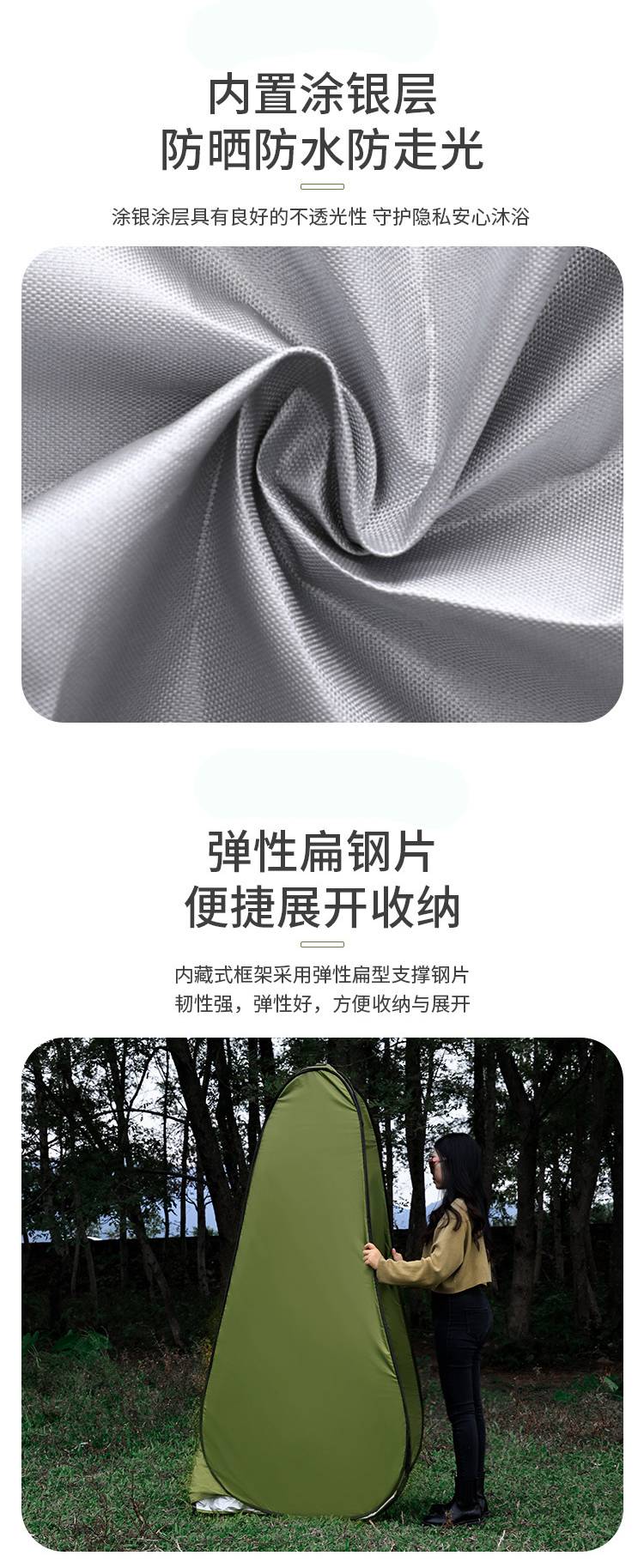 应用于野营、洗澡、更衣、摄影、观赏,户外移动简易厕所,也可用于家居洗澡保暖等。实用性强,便携,开合简单等