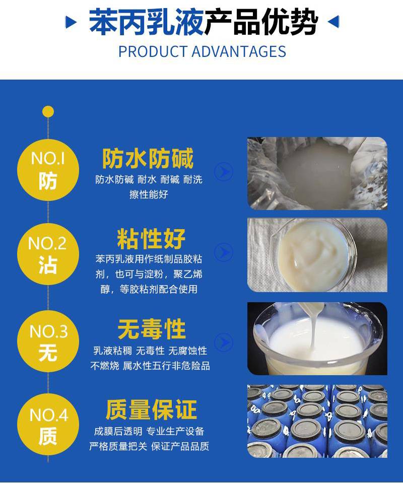 天酬供应高含量苯丙乳液 金属表面乳胶涂料 纸品胶粘剂 耐水耐油