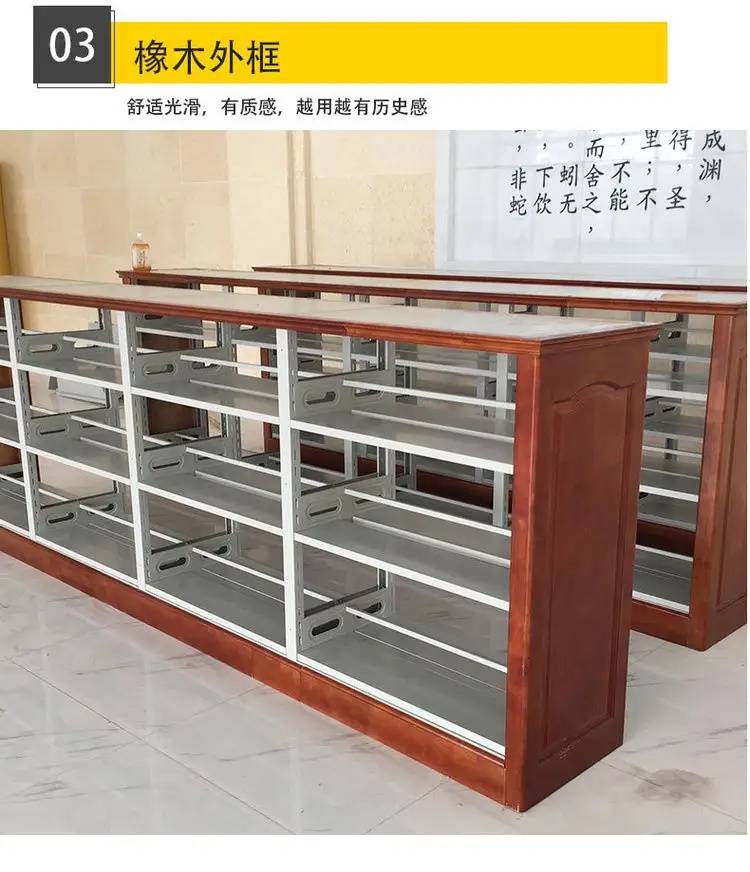 金钱豹阅览室橡木平面双面钢木书架易清洁材质精选厂家直供