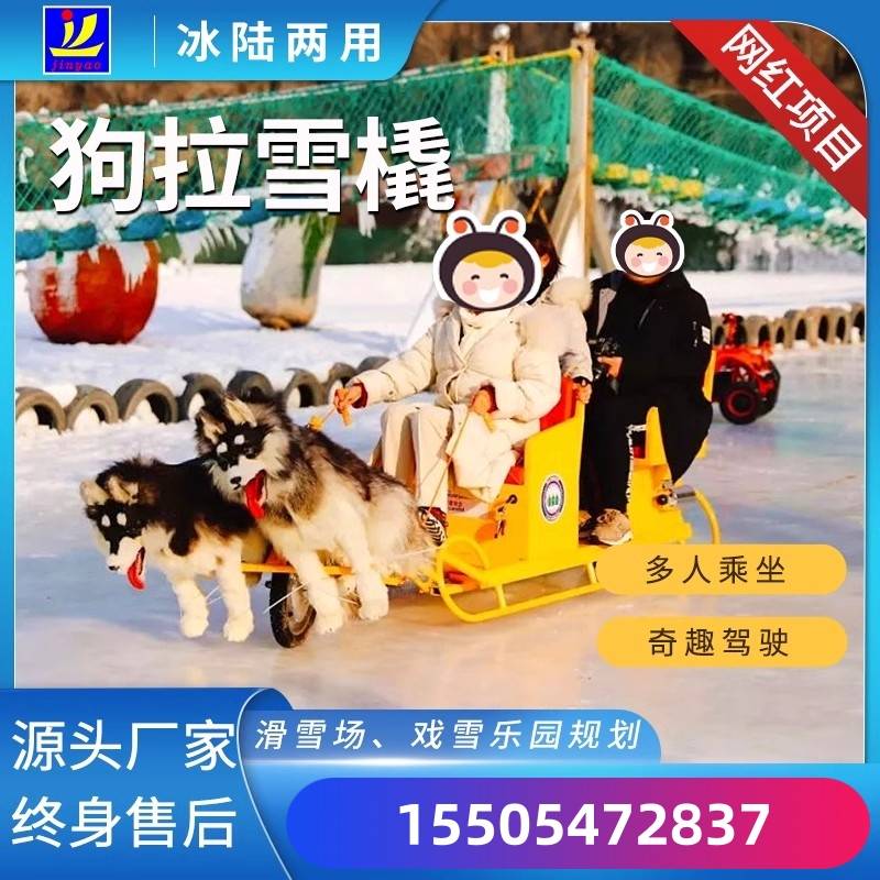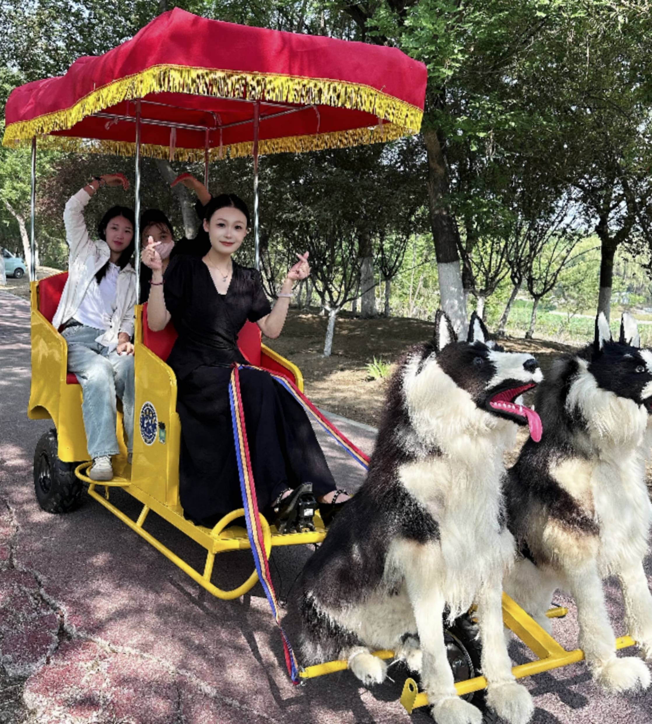 景区观光车 可爱的狗狗拉着色彩鲜艳的载人电动车