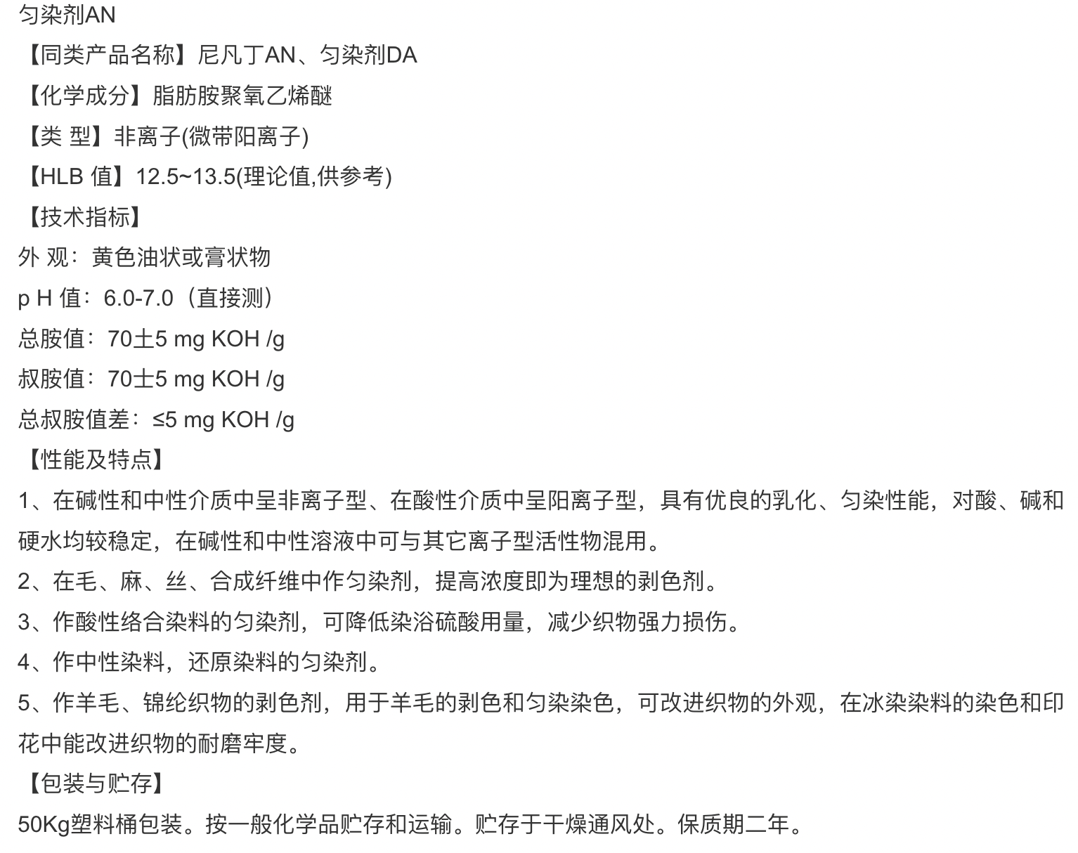 2222尼凡丁AC1820 可用作匀染剂AN 脂肪胺聚氧乙烯醚 可用于印染助剂