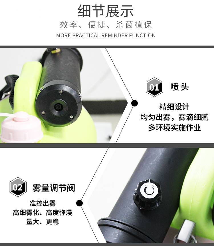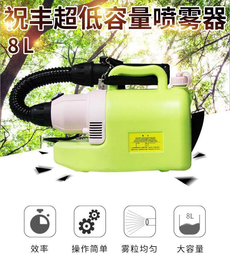 祝丰DJ-8L超低容量喷雾器,采用大功率电机,射程远,出雾量大,符合杀虫、消毒、除甲醛使用要求。