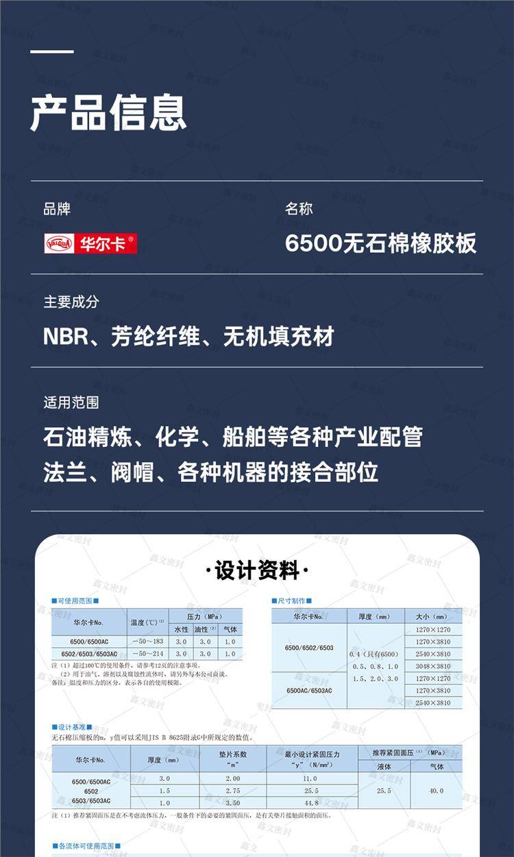 6500无石 棉橡胶板 密封垫片 售后完善 使用寿命长 华尔卡