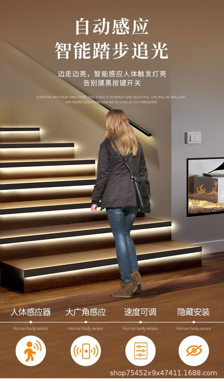 led楼梯踏步灯 免布线智能追光台阶感应灯 带流水嵌入式楼梯灯 超麦