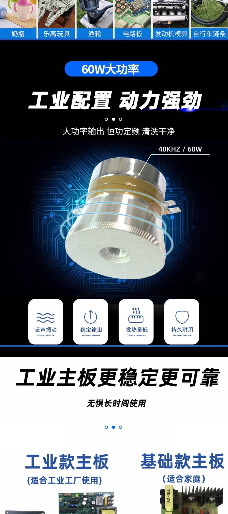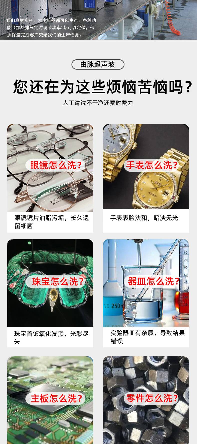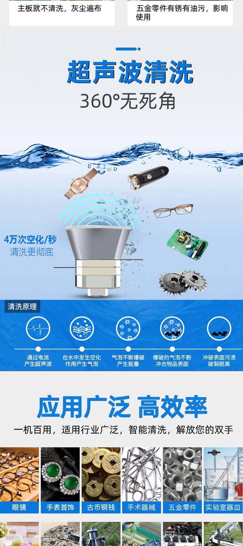家用:洗眼镜、珠宝首饰、手表、玩具、口琴、奶瓶、茶具清洗、洗餐具碗筷、蔬菜、小龙虾等 实验室使用:清洗、分散、搅拌、溶解、震荡等 工业适用:除油、除锈、除蜡、除胶、除灰尘、除油漆油墨、除焊迹氧化皮、除松香焊锡、积碳 生物制药:清洗,检测,分散、均质、溶解、加速反应