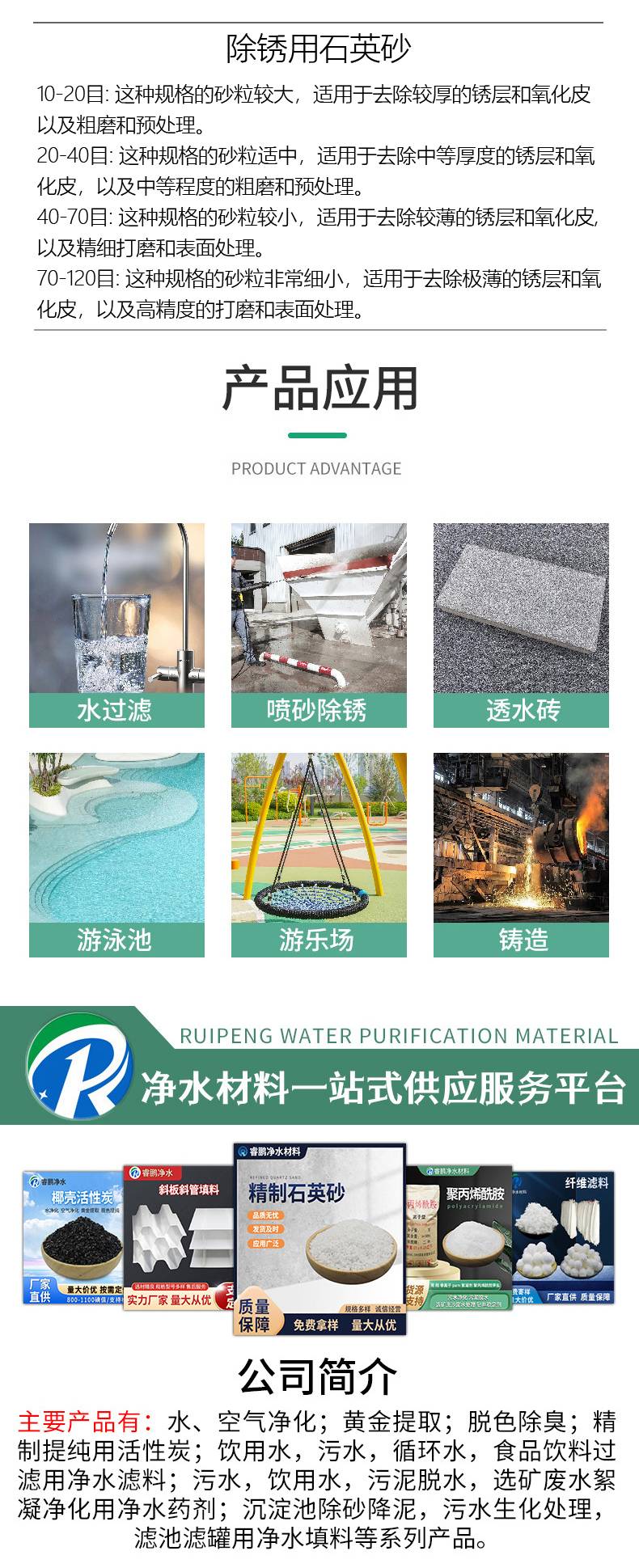 应用于人工草坪,喷砂,铸造,玻璃,透水砖,耐火材料,磨具磨料,水净化等行业。