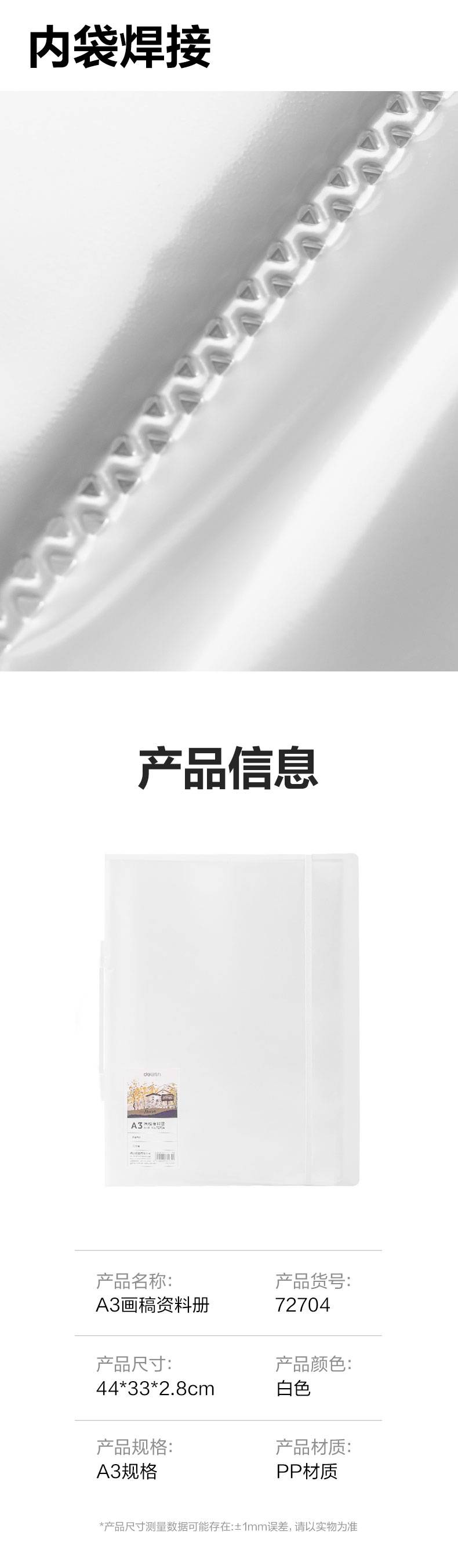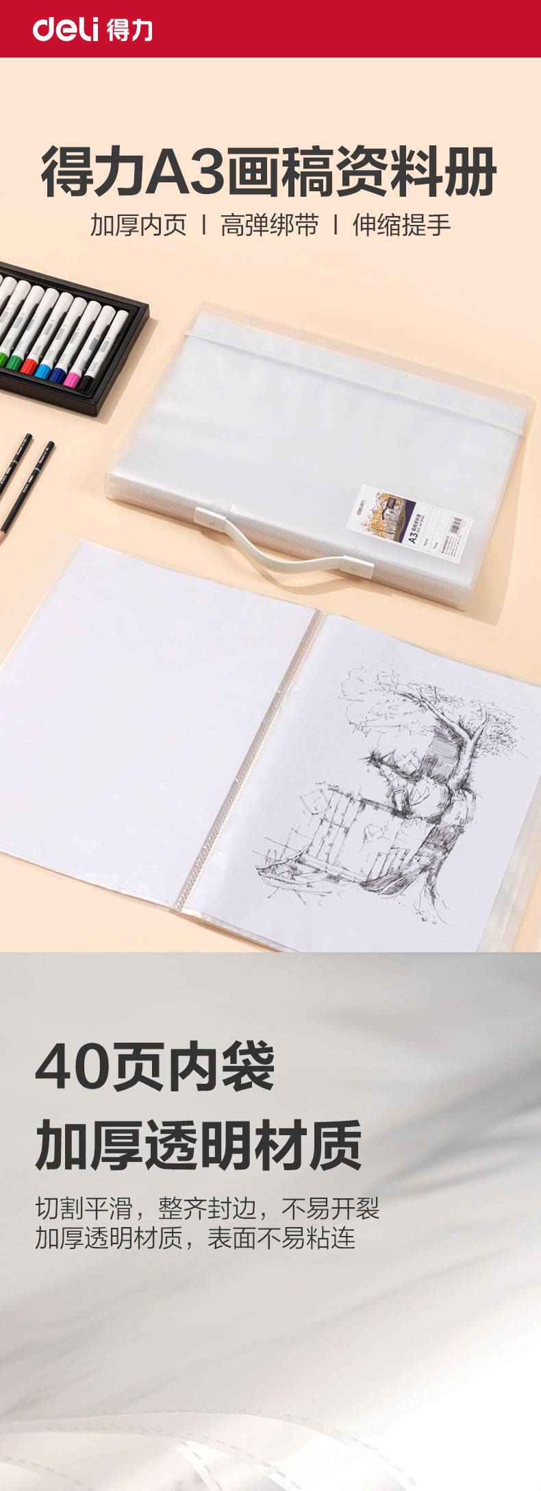 得力72704_A3画稿收集册(透明) 40页内袋 绑带设计 可手提